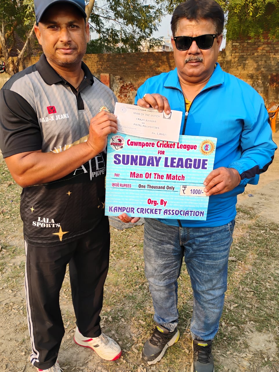 पटेल प्रॉपर्टीज ने पहले बल्लेबाज़ी करते हुए 29.3 ओवर में 204 रन बनाए। ओम मिश्रा (64), मो. जावेद (37), मनीष गौड़ (24) और गौरव पाठक (23) ने उपयोगी पारियाँ खेलीं। रवि सोनकर ने 3, नसीरुद्दीन और देवेंद्र ने 2-2 विकेट लिए। जवाब में क्रेज़ी रेज़र की टीम 183 रन पर ऑल आउट हो गई। श्रवण ने 45, आयुष पाठक ने 35 और मोहिब अंसारी ने 28 रन बनाए। शैलेन्द्र शुक्ल ने 4, मो जावेद और अंकुल ने 2-2 विकेट झटके। मैन ऑफ द मैच मो. जावेद (पटेल प्रॉपर्टीज) को प्रदान किया गया।