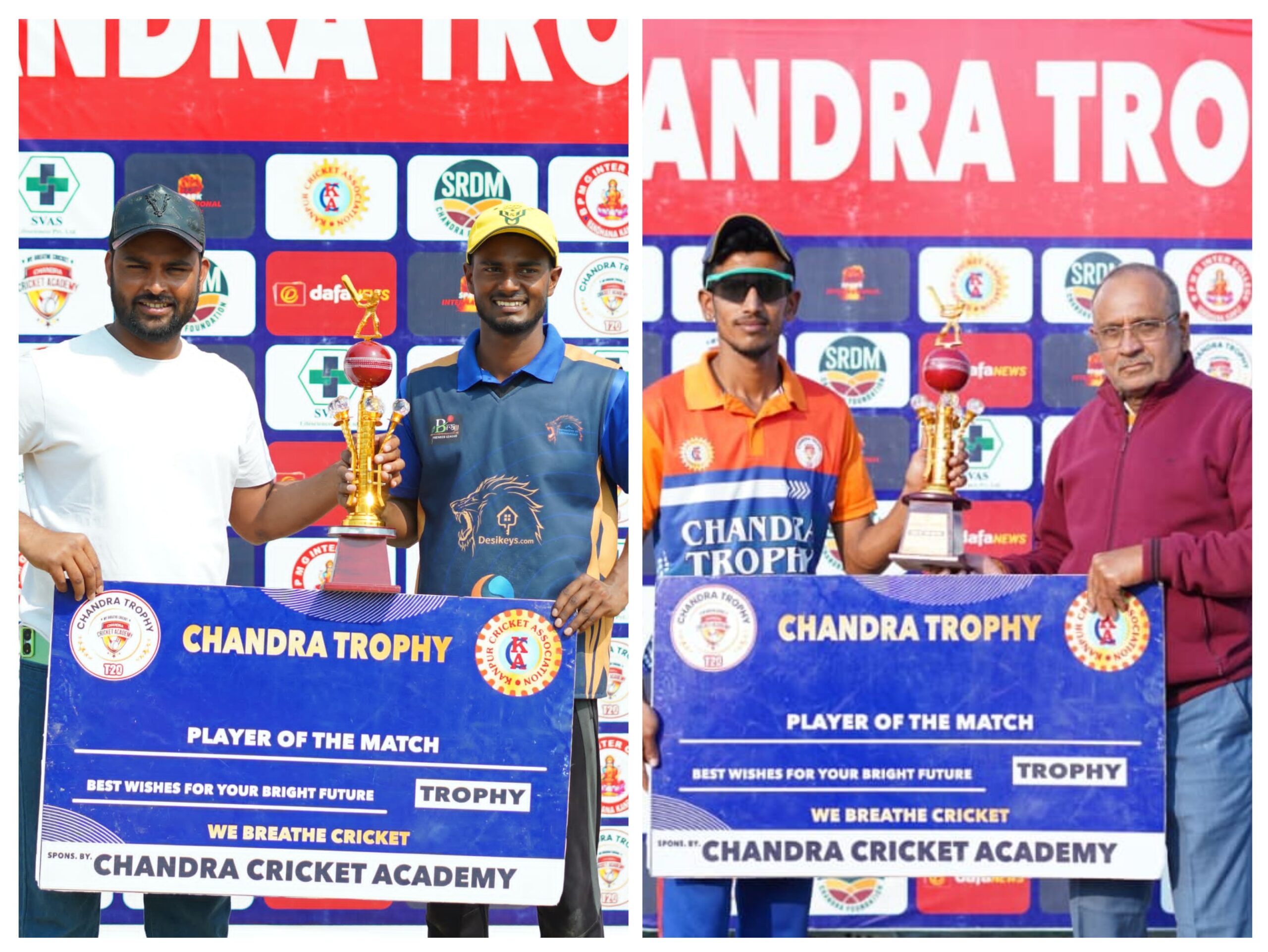 चंद्रा क्रिकेट अकादमी मैदान पर स्पार्क क्लब द्वारा आयोजित चंद्रा ट्रॉफी T20 क्रिकेट टूर्नामेंट के तहत खेले गए मुकाबलों में रोमांचक परिणाम देखने को मिले। सुपीरियर स्पिरिट स्पोर्ट्स अकादमी 51 रन से विजयी रहा, जबकि नेशनल यूथ क्लब ने एलिमिनेटर में 7 विकेट से मारी बाजी